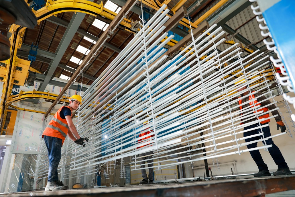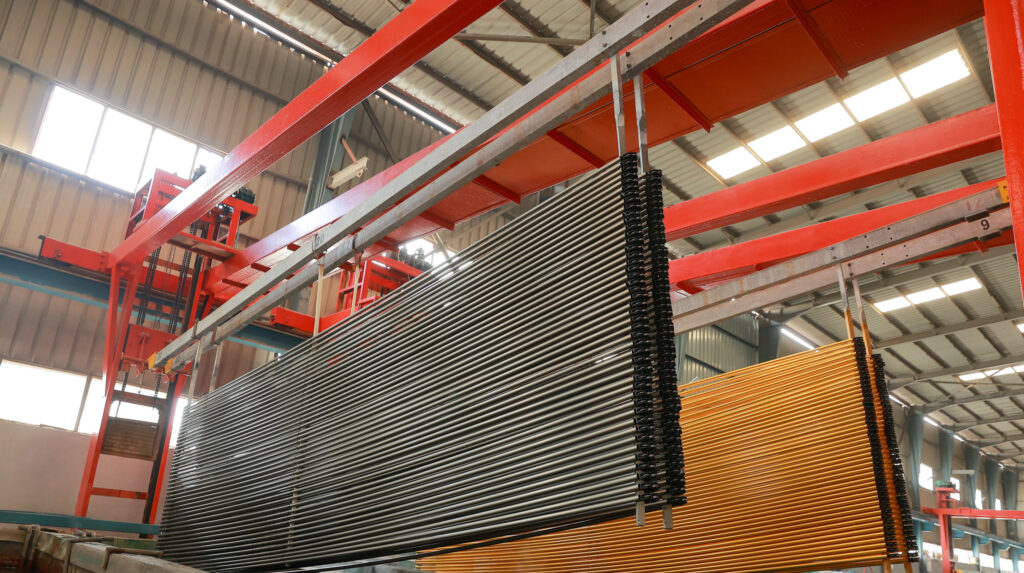 by using horizontal automated technology with the best powder quality ( AkzoNoble- Jotun) going with process (ESD) is typically used to achieve the application of the powder coating to a metal substrate.